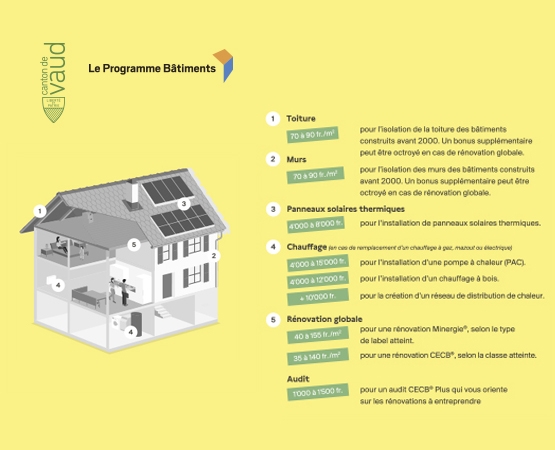 Pour 2018, le programme vaudois de subventions pour les rénovations énergétiques dans le domaine du bâtiment s’élève à 37 millions de francs, soit 5 millions de plus qu’en 2017. Les montants alloués par type d’interventions restent similaires à ceux qui prévalaient l’an dernier, à l’exception des aides pour l’installation de chauffages à bois et de pompes à chaleur qui augmentent afin de les rendre plus attractives. Les rénovations globales sont, quant à elles, encouragées de manière à mieux tenir compte des performances atteintes.